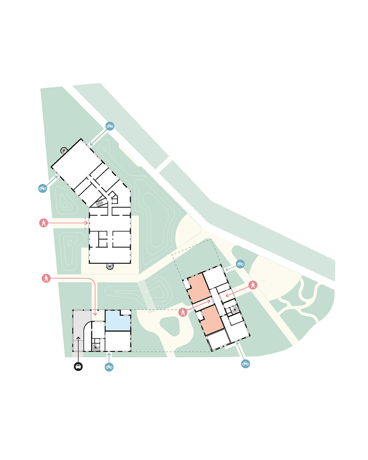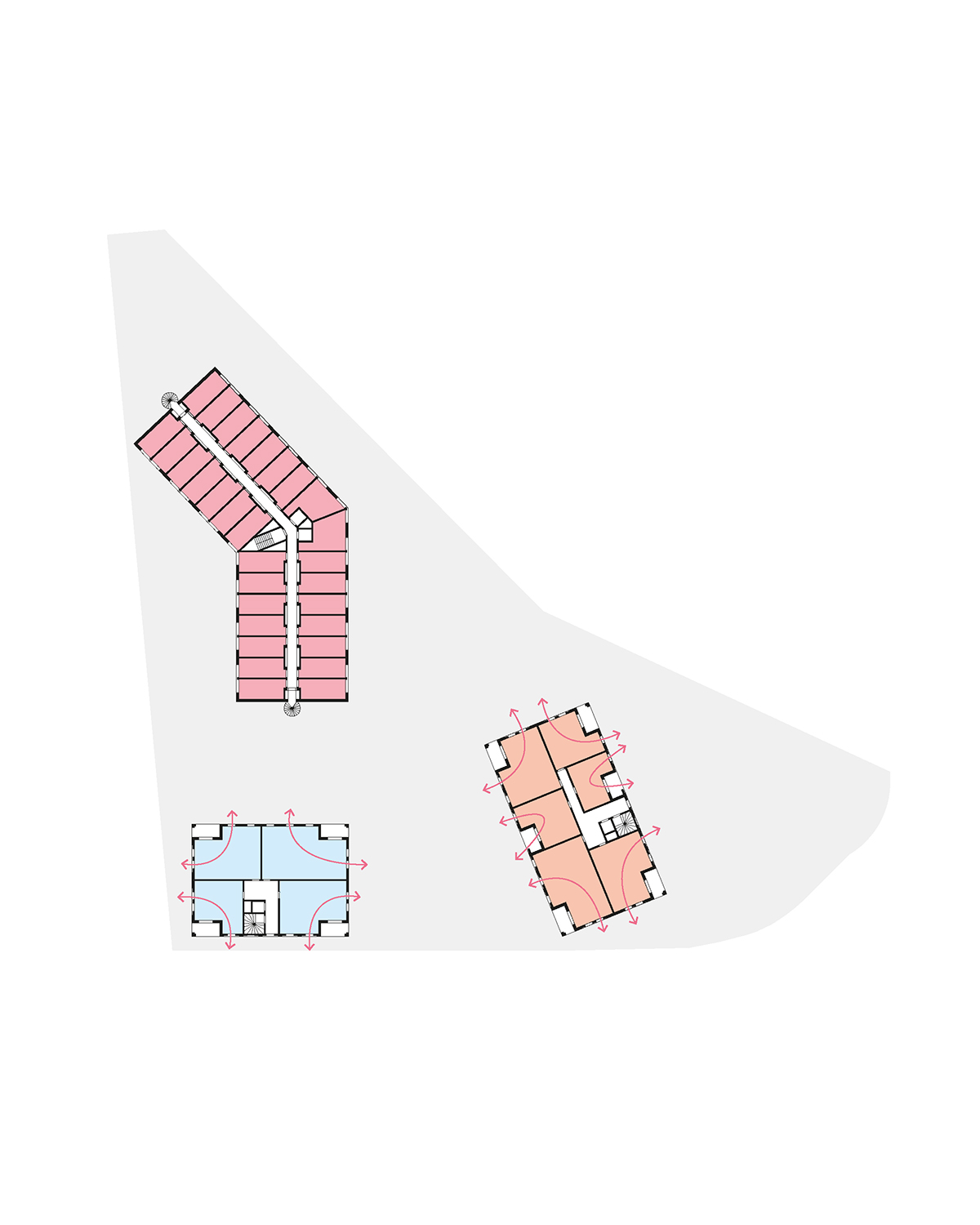 statutprojetNotre proposition pour l’ilot F3 du quartier des Deux-Lions à Tours s’inscrit dans le « faisceau », jardin central du quartier, en y implantant trois volumes compacts en éventail : deux plots accueillant l’accession libre et l’accession sociale et une barrette pliée pour la résidence mobilités. L’ensemble dessine un front bâti discontinu sur l’avenue Marcel-Dassault et la rue Jean-Carmet tout en préservant de larges perméabilités nord-sud et est-ouest à travers le cœur planté.
