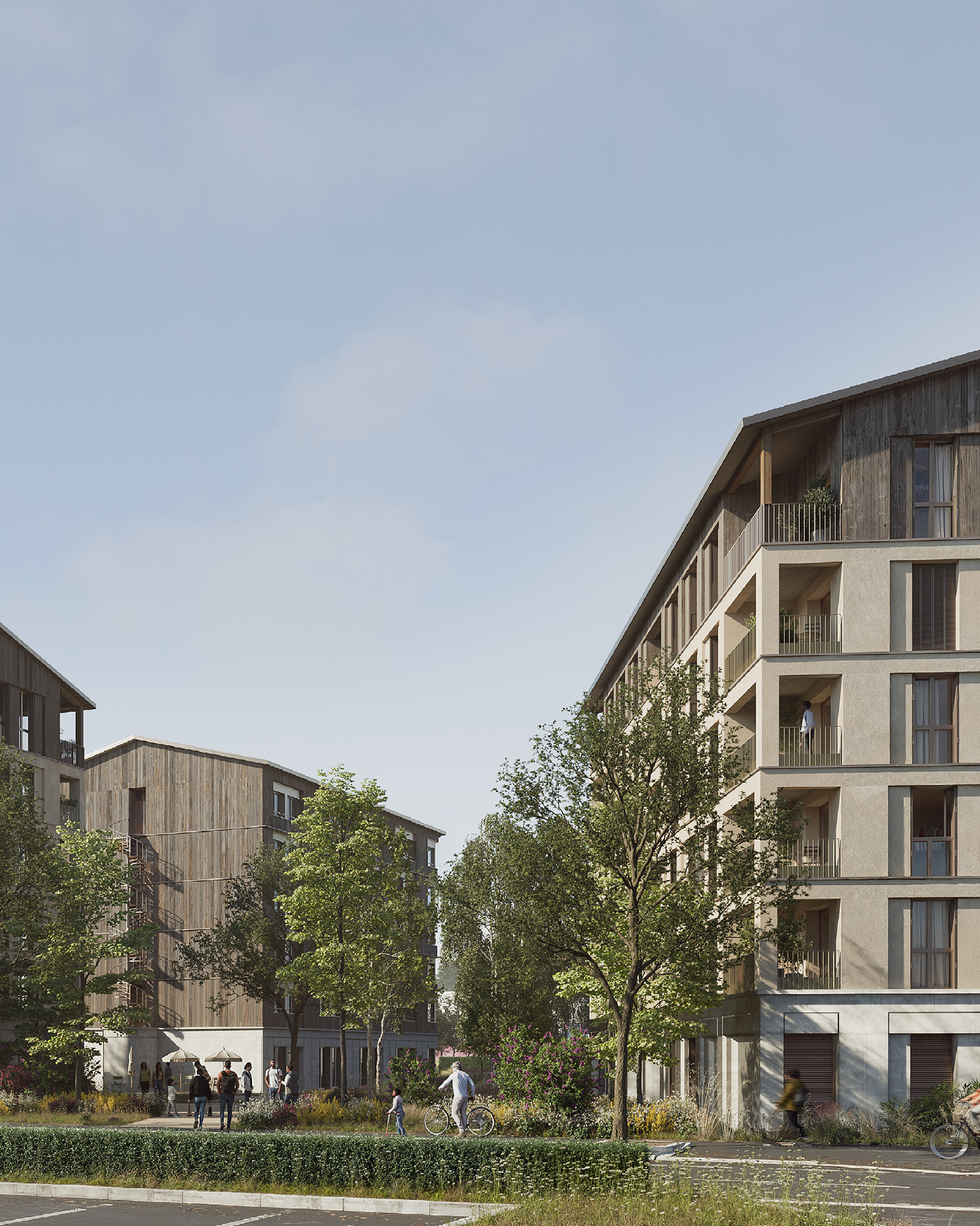 L’architecture exprime clairement sa construction, avec une structure poteaux-dalles béton et des soubassements ouverts, des façades en briques enduites pour les bâtiments d’accession et des façades à ossature bois bardées en réemploi pour la résidence mobilités. L’écriture est verticale et domestique côté accession (persiennes), plus horizontale et hôtelière sur la résidence mobilités, composant une architecture familière, comme déjà là, où le réemploi porte une mémoire matérielle.programme 53 logements, résidence mobilités de 150 studios et espaces communs maître d’ouvrage Aethica avec 3F Résidences et 3F Centre-Val-de-Loire mandataire THE architectes lieu Tours, quartier des Deux-Lions surface 6 990 m² phase concours restreint 2024 certification RE 2020 seuil 2025, biosourcé niveau 2, réemploi